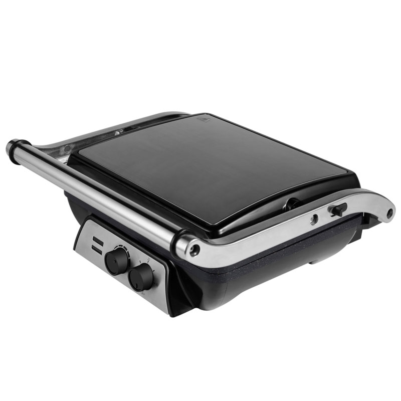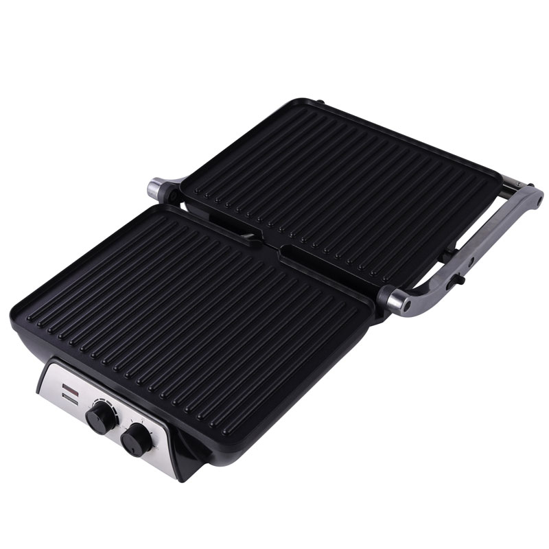 | Caratteristiche | Maniglia sicura e cool-touch; Vaschetta raccogligocce per la raccolta dell'olio in eccesso; Manopola di controllo della temperatura regolabile; Rivestimento antiaderente per una facile pulizia; Il sistema di cerniere flottanti si adatta automaticamente a qualsiasi dimensione di tostapane, carne o snack; Aperto a 180°C come grill aperto; Spie di accensione e pronto; Piedini antiscivolo |